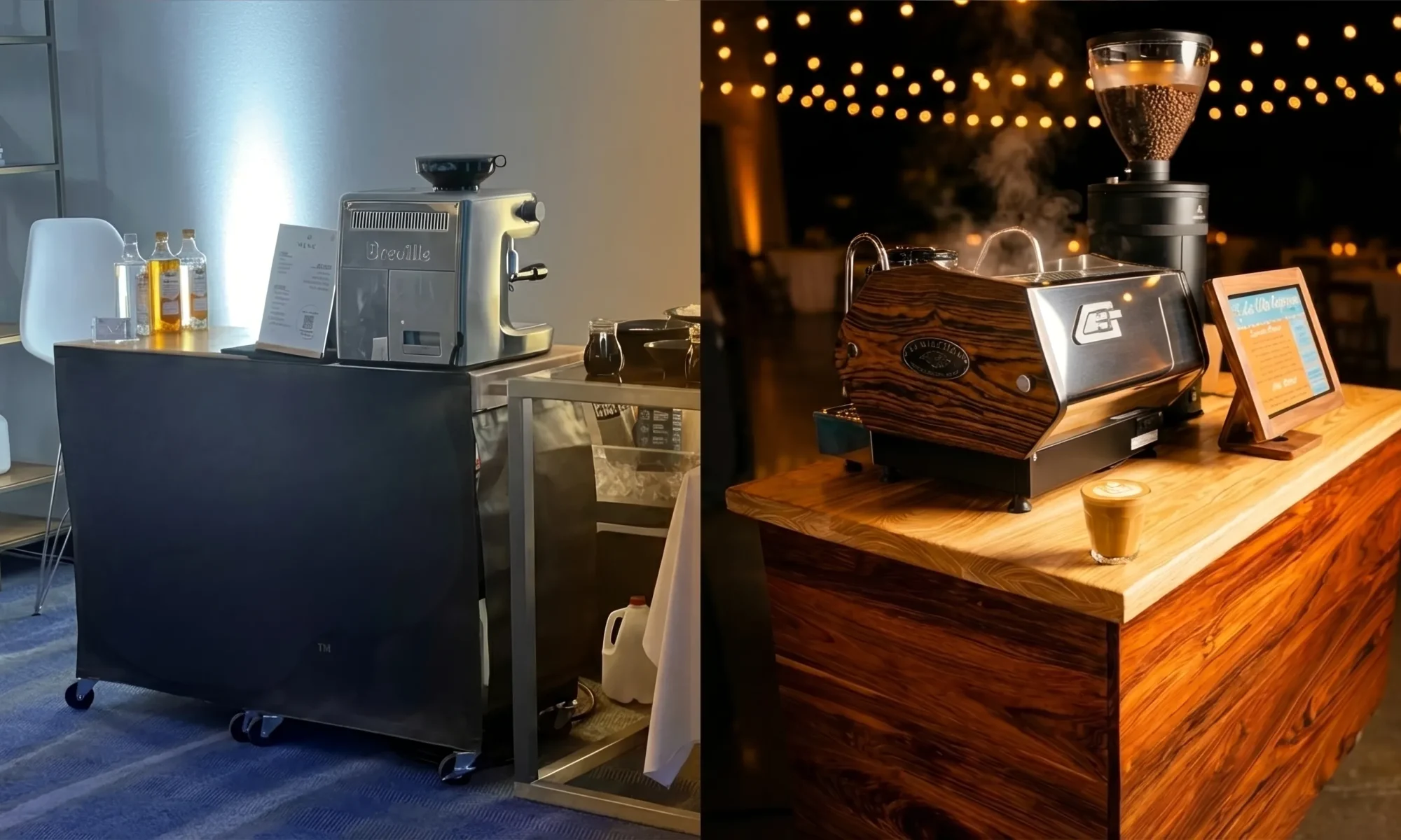 Folding table with a wrinkled vinyl skirt. A Breville wheezing through one drink at a time while 100 guests stare at the back of each other’s heads. The line snakes past the dessert table. Someone gives up and grabs water instead. The barista — hired off Craigslist yesterday — is Googling “how to froth milk” between orders. The espresso tastes burnt. The cups are gas station quality. Your guests get coffee. They don’t get a story. They don’t take a photo. They don’t mention it on the ride home. It happened. That’s the best thing you can say about it.